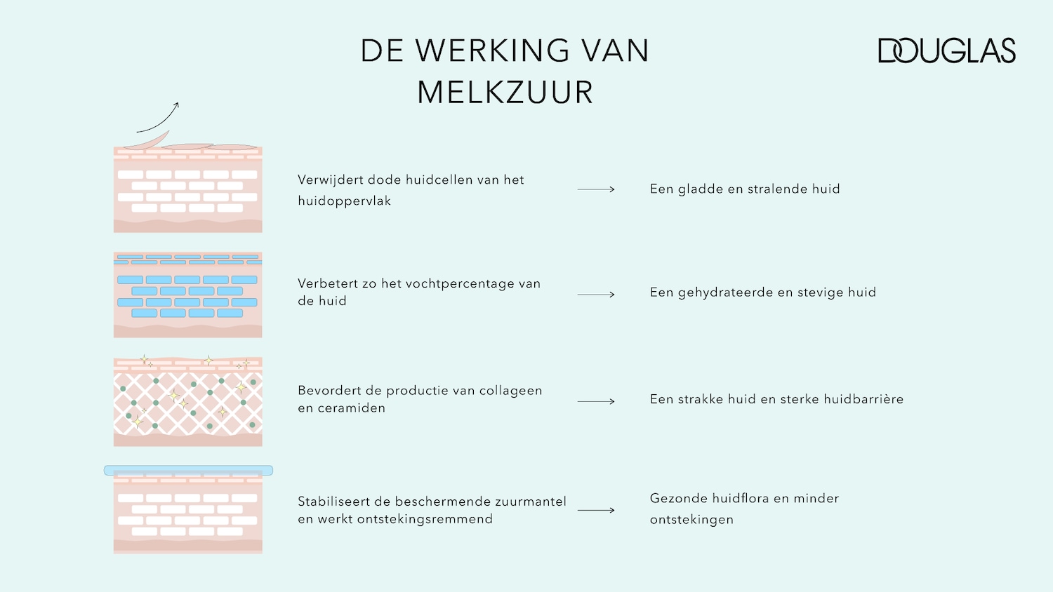 Melkzuur is een van de natuurlijke vochtvasthoudende factoren in de huid. Als zodanig is melkzuur een vrij klein, vochtminnend molecuul. Dit betekent dat vocht actief wordt gebonden en dat er een zogenaamd hydraathulsel wordt gevormd. Dit is dan verantwoordelijk voor het hydraterende effect. Melkzuur is ook essentieel voor een intacte beschermende zuurmantel en een gezonde huidflora. Over het algemeen heeft het huidoppervlak daardoor een vrij zure pH-waarde. Dit creëert een omgeving waarin de huideigen bacteriën goed gedijen. Daarentegen remt deze omgeving de groei van bacteriën en micro-organismen die vreemd zijn voor de huid.